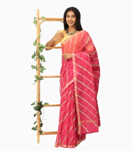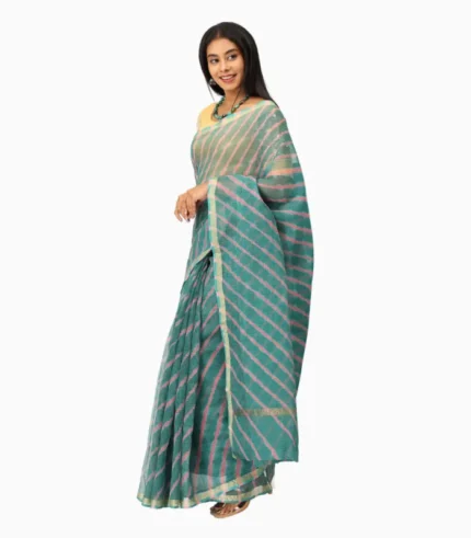 It blends Rajasthan’s iconic lahariya craft with airy Kota Doriya fabric. The dual-tone navy and orange palette, contrast blouse, and effortless drape create an elegant yet comfortable choice, making it a highly appealing saree for modern fashion enthusiasts.