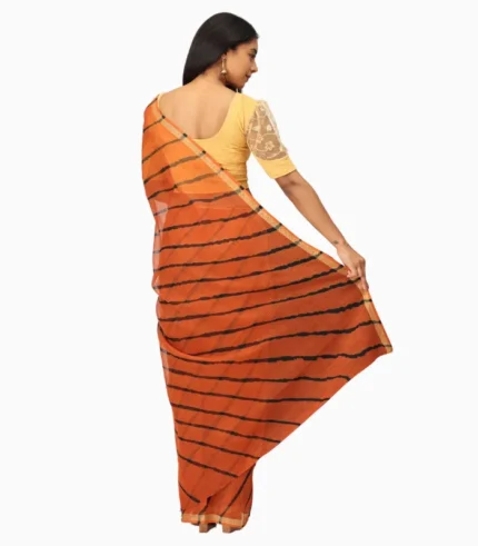 Yes, it includes a 0.8-meter contrast blouse in orange shade, perfectly complementing the navy blue lahariya design. The blouse fabric completes the saree, offering a cohesive look and making tailoring convenient for personalized styling and comfort.